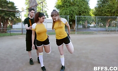 Sexy football nymphs are porked and jizzed by horny coach with big cock